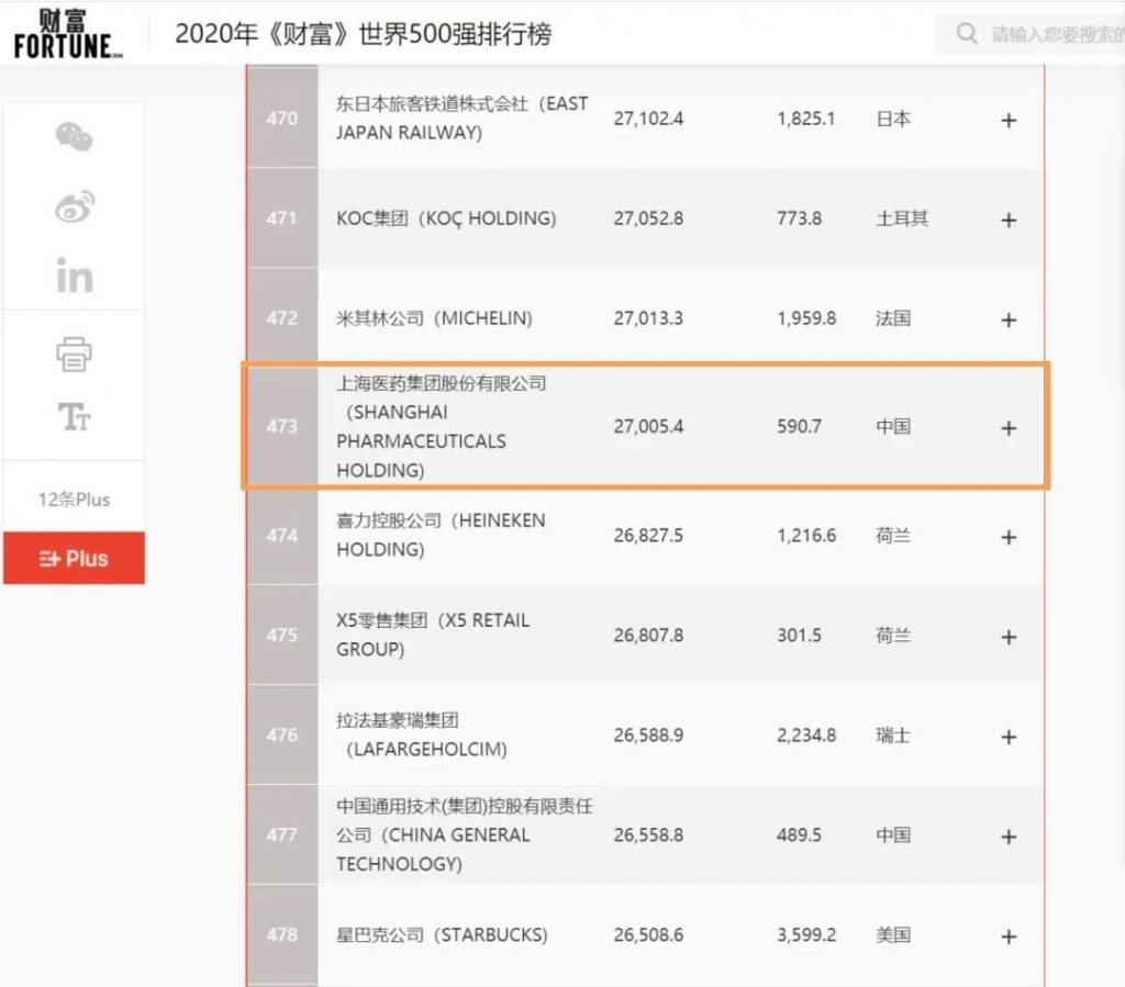 2020年8月10日,《財(cái)富》雜志正式發(fā)布“2020年《財(cái)富》世界500強(qiáng)排行榜單”,上海醫(yī)藥集團(tuán)股份有限公司(601607.SH,02607.HK,以下簡(jiǎn)稱“上海醫(yī)藥”)首次進(jìn)入榜單,位列第473位,中國(guó)企業(yè)排名第124位。榜單顯示,全球共有21家醫(yī)藥企業(yè)上榜,上海醫(yī)藥是其中僅有的兩家中國(guó)藥企之一。